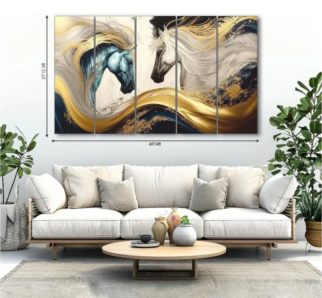 Add a sense of power and elegance to your home with this mesmerizing 5-panel wall art featuring two spirited stallions. Designed with fluid gold and navy strokes, the piece captures motion, energy, and beauty in one unified artwork. The metallic hues and dynamic composition make it ideal for living rooms, offices, or gallery-style decor, blending modern aesthetics with a touch of nature-inspired boldness.