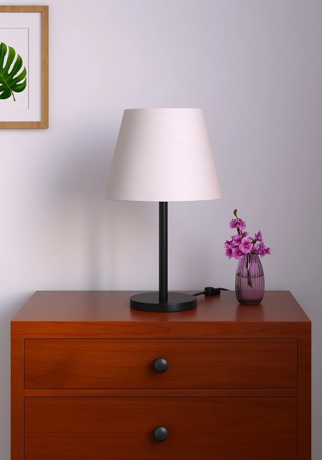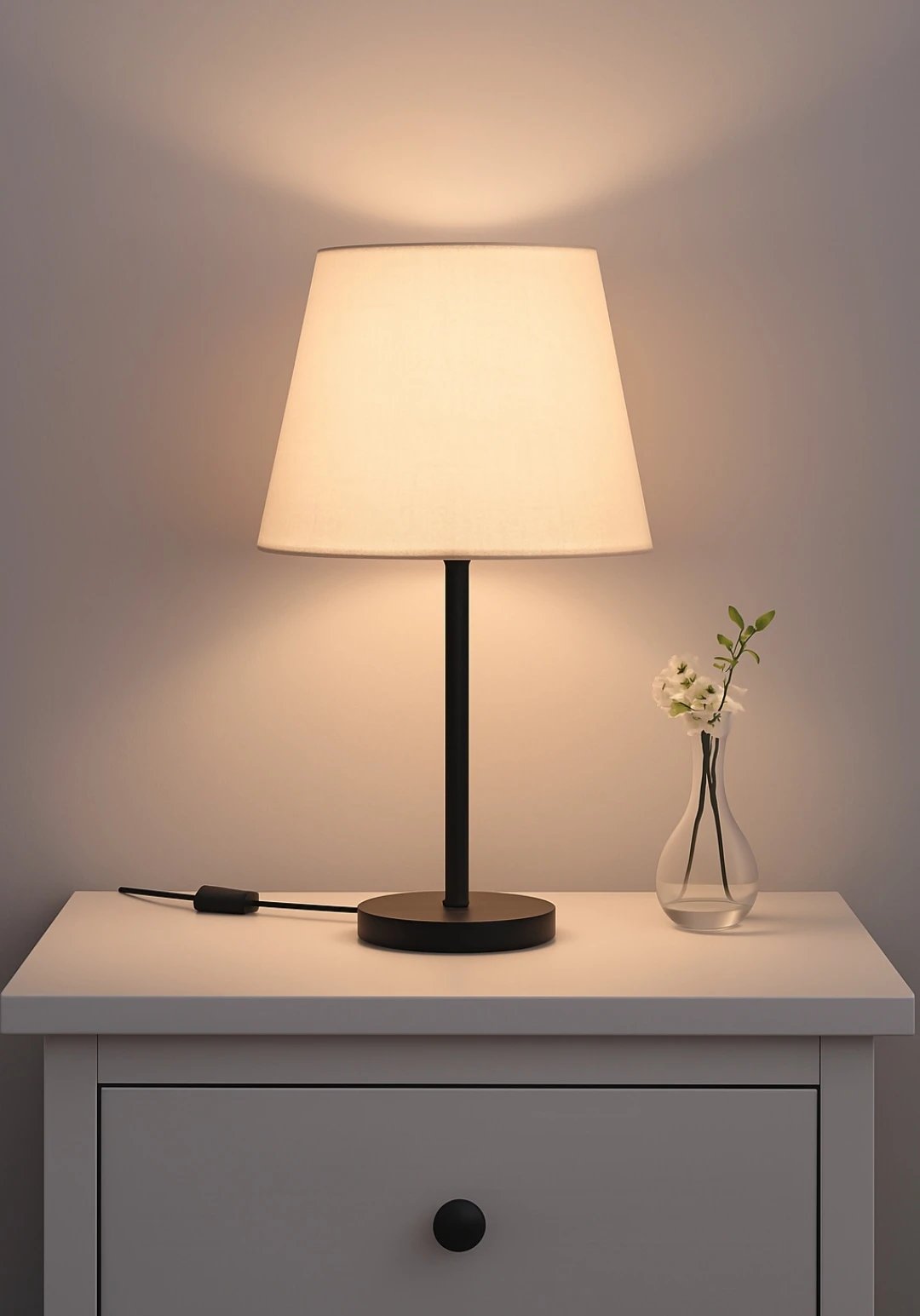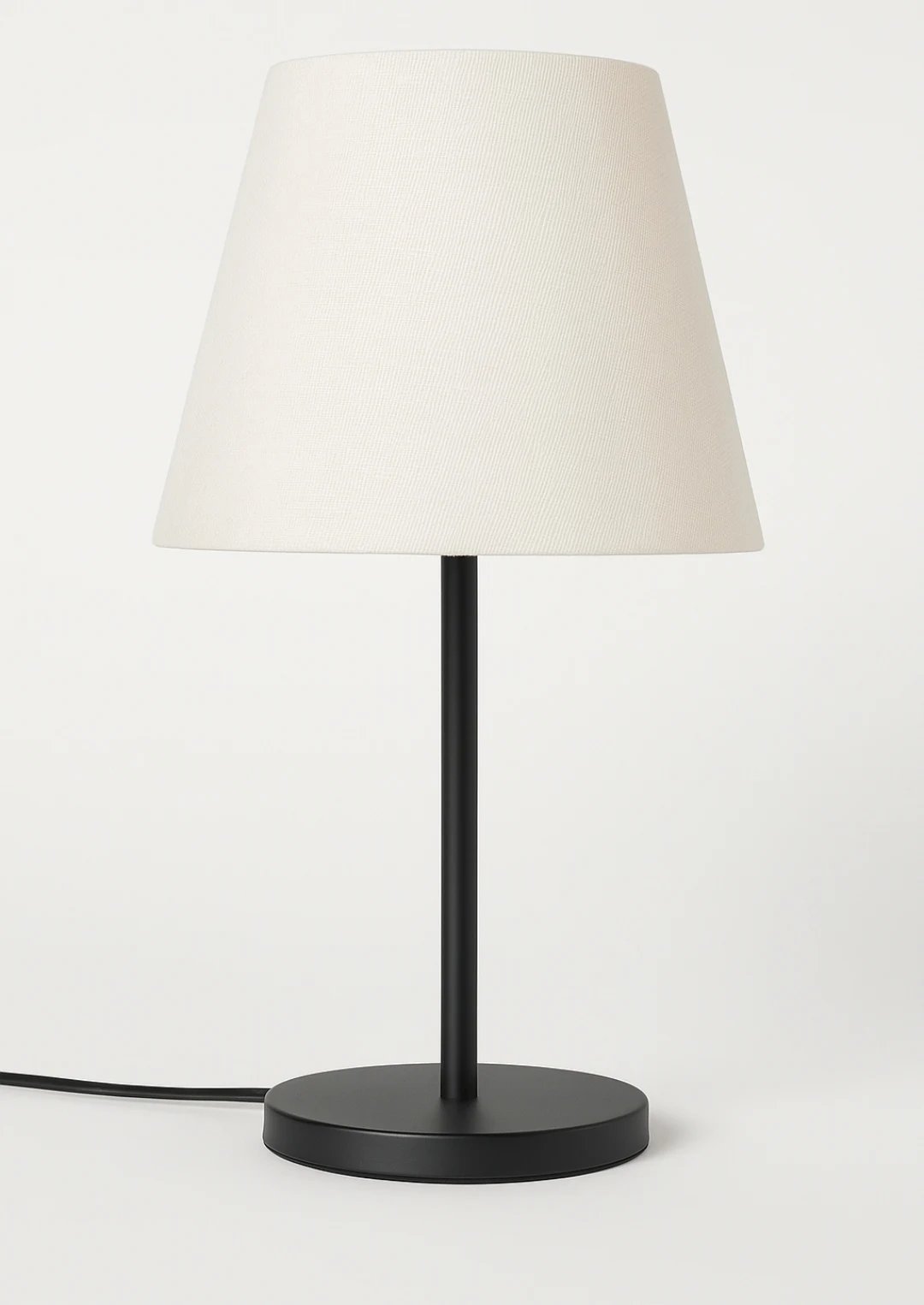 Enhance your room’s aesthetic with this minimalist bedside table lamp. Featuring a clean, contemporary design, it includes a soft fabric lampshade that diffuses a warm and cozy light—ideal for reading, relaxing, or setting a calm atmosphere. The slim black metal stand and round base provide stability and elegance, blending seamlessly into modern, Scandinavian, or minimalist decor. Includes an inline switch for easy operation.